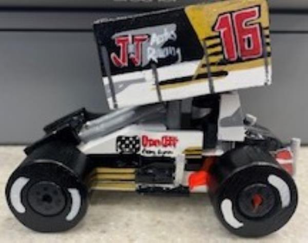 This wooden Replica of our 2025 NSCHOF&M #16 Sprint Car is hand painted in black, red, gold, white, showcasing two sponsors. J&J Auto Racing and Don Ott, perfect for young Sprint Car fans made in the U.S.A. by Dennis Guerra.