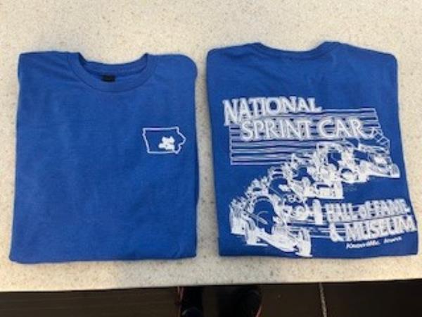Gildan Soft Style 60/40 cotton/polyester, on the front left side of the chest is a outlined logo of the state of Iowa with a Sprint car inside of it. The back side says National Sprint Car Hall Of Fame & Museum Knoxville, Iowa with 5 Sprint Cars the Non-Winged that raced in the 1940's to the Winged Sprint Cars of the 80's. Screen printed in the U.S.A. Available in sizes small-3XL.
