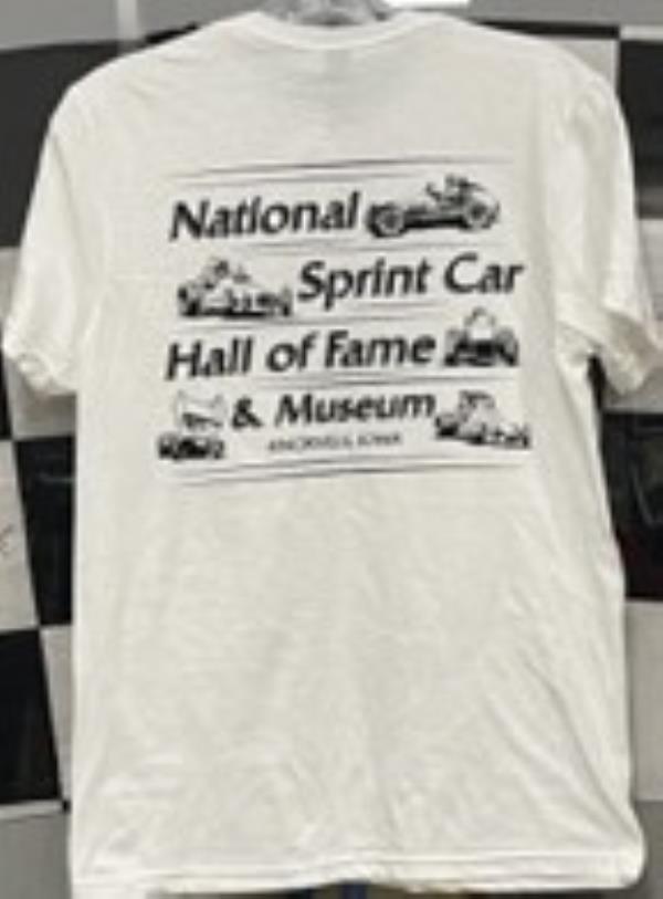 Short Sleeve Gildan 60/40 Cotton/Polyester T-Shirt. Feautures a small NSCHOF&M Logo on the front left chest, the back has the National Sprint Car Hall of Fame & Museum, Knoxville, Iowa with 5 Sprint Cars , the non-winged Sprint Cars that raced in the 1940's to the Wimged Sprint Cars of the 80's. Screen printed in the USA. Available in sizes Small-4XL.