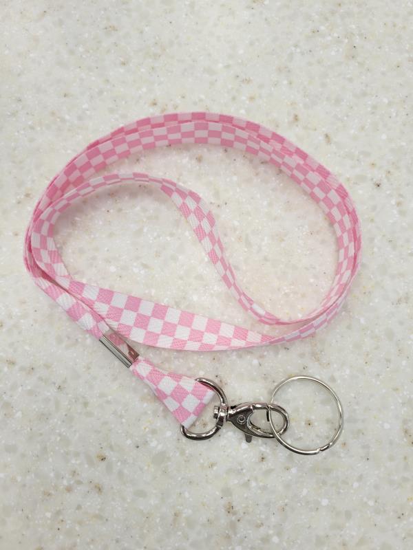 This 20 inch long lanyard is designed with a heavy duty pinch clasp and split D-ring. Comes in pink and white, or black and white.