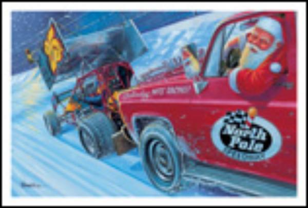 Package of 10 Christmas cards and envelopes. Santa is in the North Pole Speedway push truck sending out the #25x winged sprinter on the snow covered track.