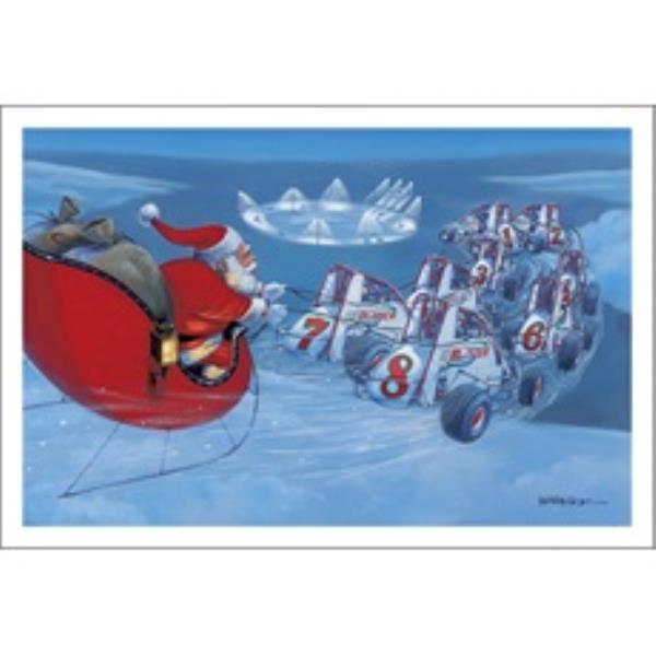 This card depicts Santa Claus racing his eight sprint cars through the air to get to the snowy lights of the dirt track down below. Each package contains 10 cards with envelopes. Designed by Paul Oxman Publishing.