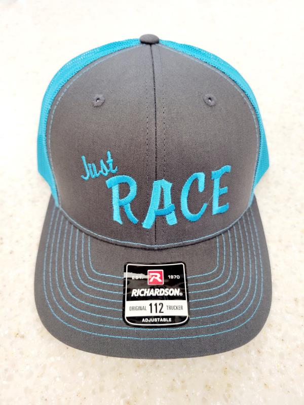 It is structured, six-panel, mid-profile, with a pre-curved contrast stitched visor and the underbill matches the color of the visor. Also has an adjustable plastic snapback. The words "Just RACE" are embroidered in neon blue on the front of the hat. Comes in one size.