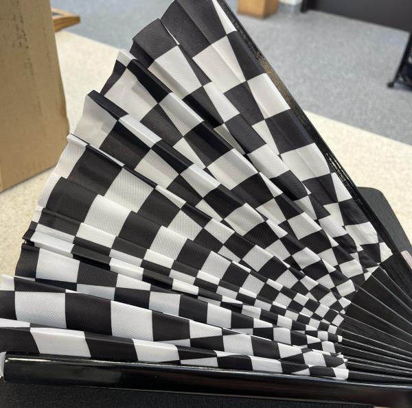 This checkered clapper fan meaurues about 14 in wide, light weight, nice to have on a hot race night.