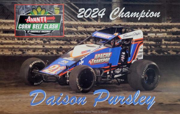 Daison Pursley is the 2024 Corn Belt Clash Champion at Knoxville Raceway in his Team AZ/Apache Racing #21AZ non-winged sprint car. At the Avanti Windows & Doors Corn Belt Clash Pursley pocketed a $12,000 top prize and the distinction of becoming the first points-paying USAC National Sprint Car feature winning driver since 2022.