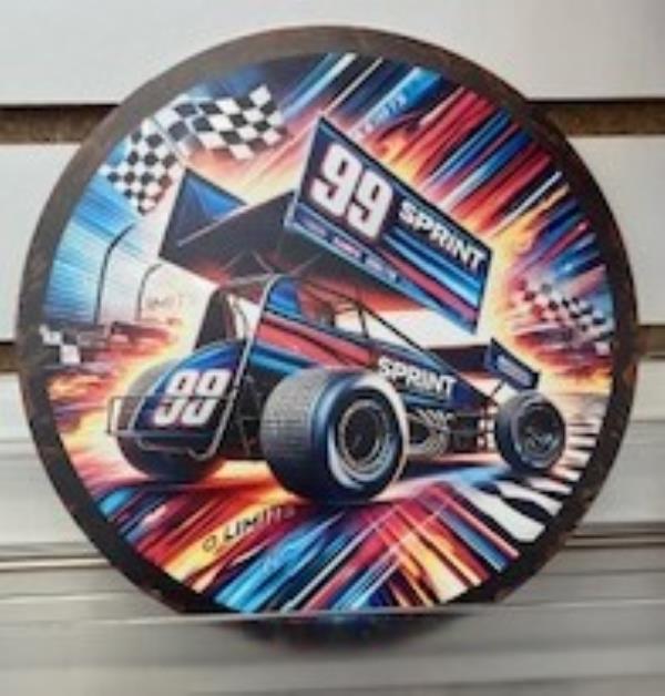 Round Tin sign 8x8 with a Sprint Car that says 99 Sprint on the wing, with differnt colors Red, Blue, Black and White, with some checkered flags.
