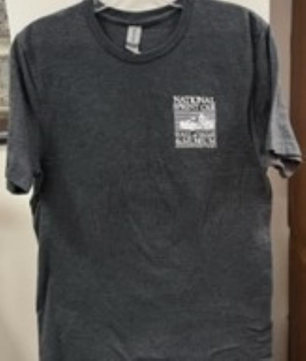 Pitch Black Mist short sleeve Gildan T-Shirt 60/40 Cotton/Polyester. Features a small NSCHOF&M Logo on the front left chest, the back has the National Sprint Car Hall of Fame & Museum, Knoxville, Iowa with 5 Sprint Cars the non-Winged Sprint Cars that raced in the 1940's to the Winged Sprint Cars of the 80's. Screen printed in the USA. Available in sizes Small-3XL.