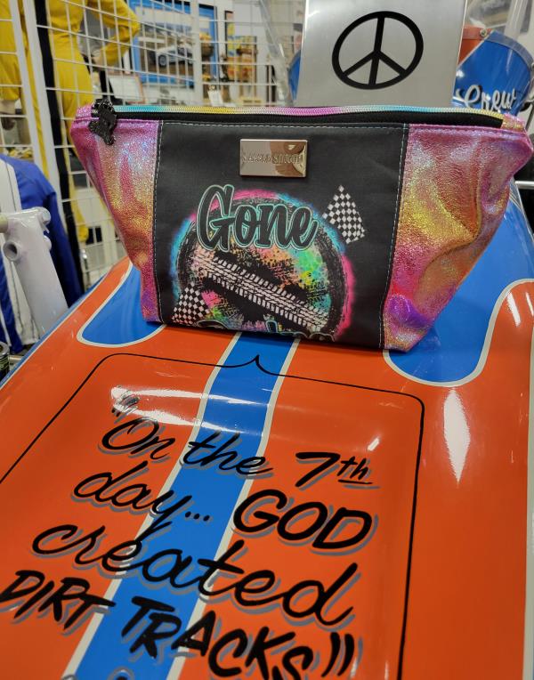 Our handmade travel clutch prevents you from misplacing your beauty and hairstyling products allowing you to store them all in one safe and secure space. They are made from cotton and vinyl, on the exterior, with water-proof canvas on the interior. Each one is uniquely handcrafted featuring a main zipper pocket with a sprint car charm. And if you get some dirt in your clutch from the track, don’t worry! These clutches are also so easy to clean, all you need is a damp cloth. Measures 14 inches in length by 5 inches in width as well as 8 inches in height. Stitch’d up with love and a splash of sass! Made locally.