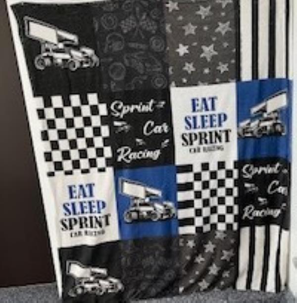 Throw size blanket that says Eat, Sleep, Sprint Car Racing on the front in colors of blue, black and white. 60X50.