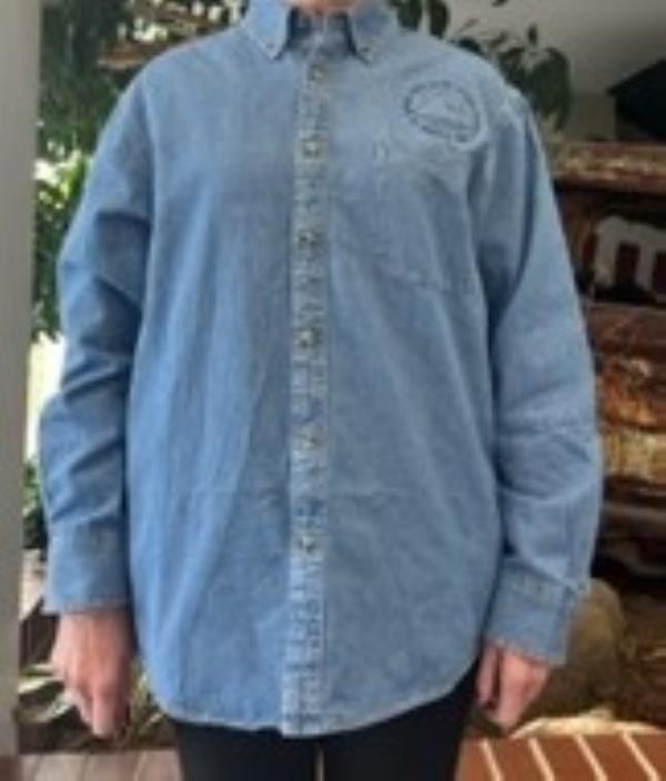 Faded Denim Port Authority button down shirt and collar with the words National Sprint Car Hall of Fame & Museum embroidered in navy lettering around a sprint car outline above the left chest pocket. 100% cotton.