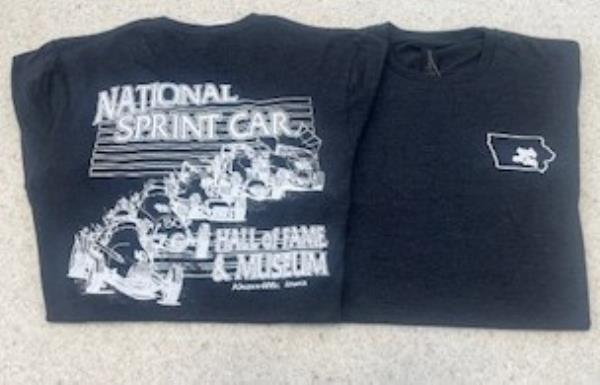 Gildan Soft Style 60/40 cotton/polyester. This shirt has a small logo outline of the state of Iowa with a Sprint car inside on the left front chest, on the back it says National Sprint Car Hall Of Fame & Museum Knoxville, Iowa with 5 Sprint Cars the Non-Winged that raced in the 1940's to the WingedSprint Cars of the 80's. Screen printed in the U.S.A. Available in sizes small-3XL