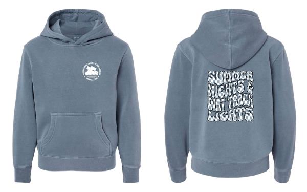 Our youth hoodies are made of 80% cotton and a 20% polyester blend. These sweatshirts also include a jersey lined hood with double-needle split stitch sewing on all seams, and a woven label. On the front of the hoodie is a circle logo featuring a white sprint car and around the outside of the logo it states “National Sprint Car Hall of Fame & Museum” in white lettering. On the back of the sweatshirt it features the words “Summer Nights & Dirt Track Lights” in a pink and white, or blue and white, checkered pattern. Comes in sizes Small – XL.