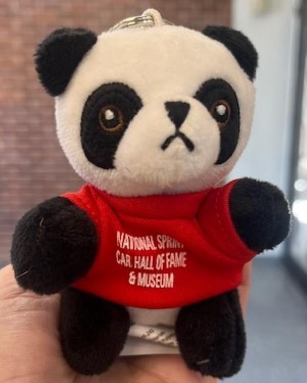 these are plush key chains made out of polyester fibers, surface washable 3' seated, wearing a T-shirt (assorted colors) that says National Sprint Car Hall Of Fame & Museum.