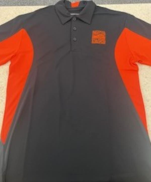 Our logo is done in orange stitching on the left side chest.