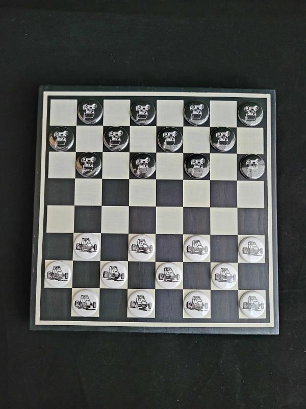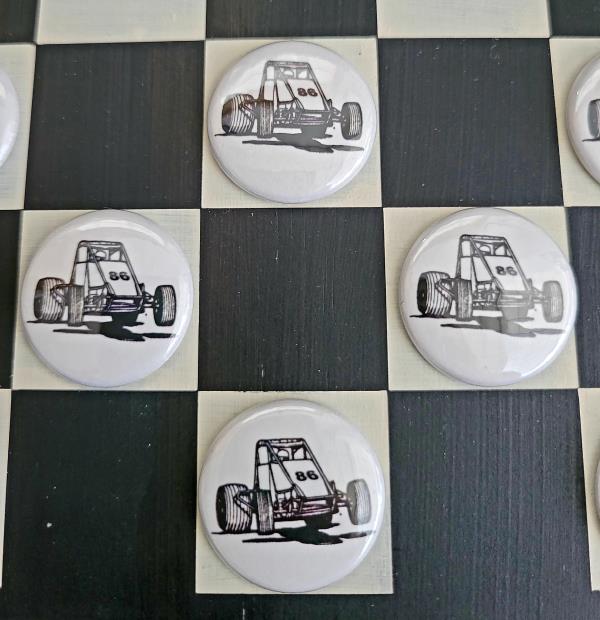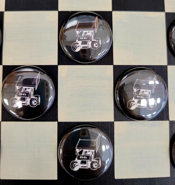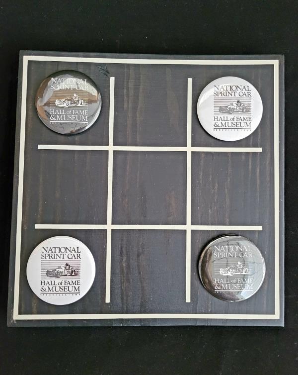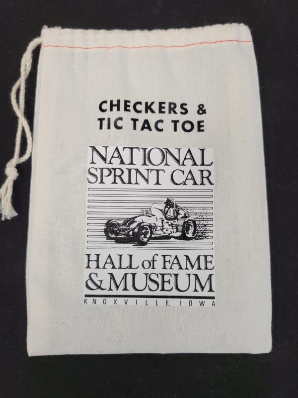 This fun sized, two-sided game board is great for your game room, living room or RV. The board measures approximately 9.25 x 9.25 inches. It comes with 24 one inch white non-winged sprint car & black winged sprint car checkers embellished with the number 86 to commerate the year we were founded. It also includes 10 two inch National Sprint Car Hall of Fame and Museum logo tic tac toe markers all in a monogrammed drawstring bag. The board is stained in black and sealed for protection. For indoor use only. Contains small pieces. Not recommended for children under age 3.