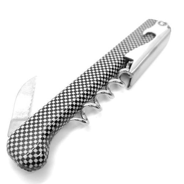 This waiter’s style corkscrew is designed to quickly and easily open wine bottles. There is a built-in serrated blade knife for effortlessly cutting through foil tops, and the special elongated nickel-plated spiral is designed to cut into the cork more quickly for opening all kinds of different wines. It has an extra-long black and white checkered handle which allows a full-hand grip, increasing your leverage.