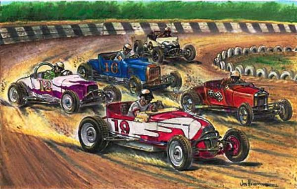 Magnificent Five print, California Roadsters Association Action at Carrol Speedway in 1947. #19 Ruttman; #12 Flaherty; #16 Rathman; #8 Sweikert; #7 Ward. 17" x 11".