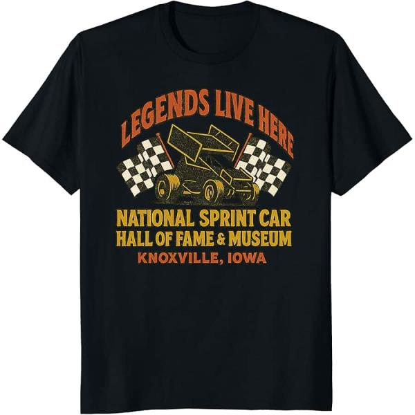 Rev up your style with this bold and nostalgic "Legends Live Here" t-shirt, celebrating the rich heritage of sprint car racing on display at the iconic National Sprint Car Hall of Fame & Museum in Knoxville, Iowa.