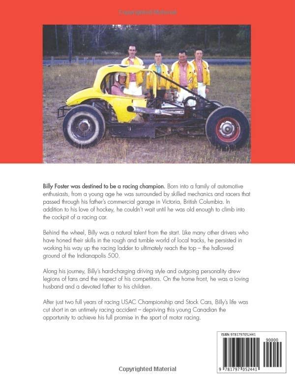 Billy Foster was destined to be a racing champion. Born into a family of automotive enthusiasts, from a young age he was surrounded by skilled mechanics and racers that passed through his father's commercial garage in Victoria, British Columbia. In additon to his love of hockey, he couldn't wait until he was old enough to climb into the cockpit of a racing car. Behind the wheel, Billy was a natural talent from the start. Like many other drivers who have honed their skills in the rough and tumble world of local tracks, he persisted in working his way up the racing ladder to ultimmately reach the top- the hallowed ground of the Indianpolis 500. Along his journey, Billy's hard-changing driving style and outgoing personality drew legions of fans and the respect of his competitors. On the home front, he was a loving husband and a devoted father to his children. After just two full years of racing USAC Championship and Stock Cars, Billy's life was cut short in an untimely racing accident- depriving this young Canadian the opportunity to achieve his full promise in the sport of motor racing.